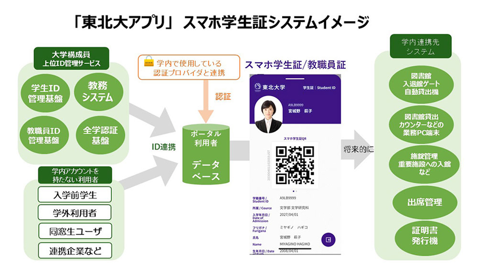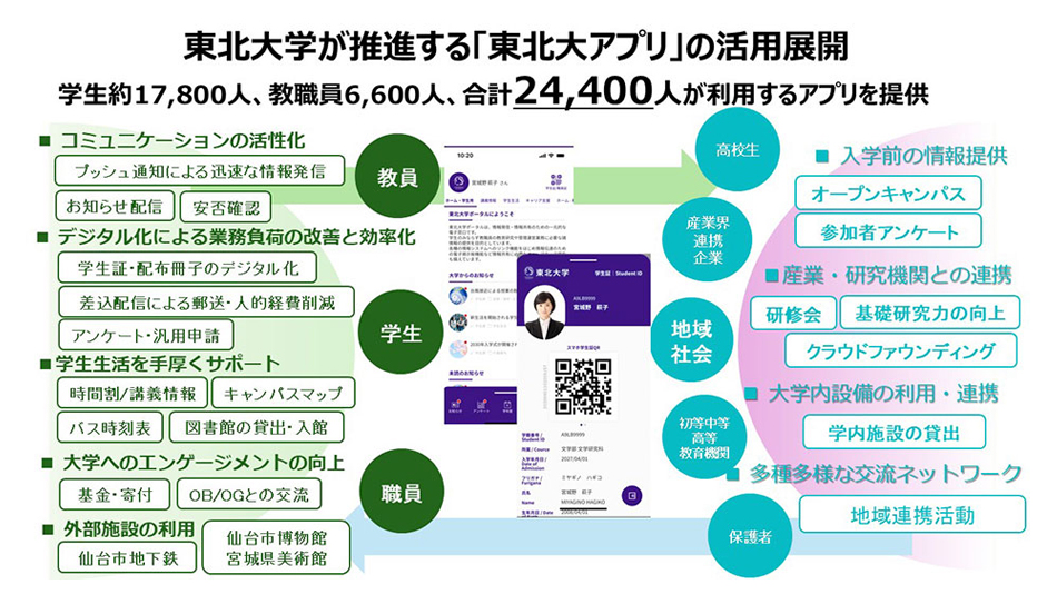 東北大学では、既に同年4月から、スマホ学生証を公的機関で見せることで、仙台市交通局の「学都仙台市バス・地下鉄フリーパス」等、購入時の本人確認、宮城県美術館や仙台市博物館での観覧料割引など、地域との接点を強化する取り組みも実現しています。