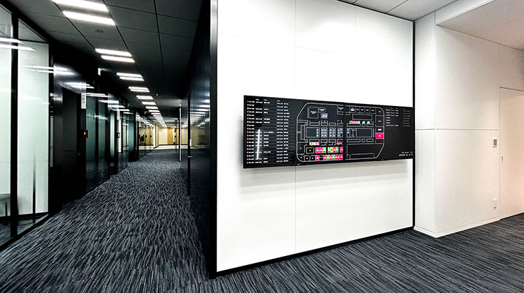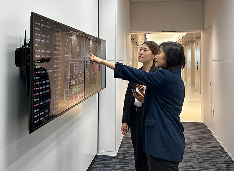 13階~14階に集中する約150箇所の会議室エリアには、社員の往来が多い4箇所7面にサイネージを設置。フロアマップ上で各会議室の予約・空室情報をリアルタイムに表示し、社員がその場で空き会議室を即座に確認・選択できる環境を整えました。