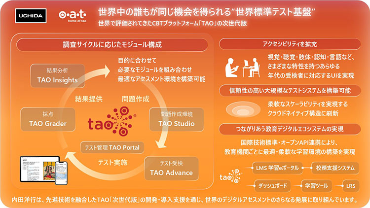 次世代版「TAO」は、これまで世界中で培われた「TAO」の理念と信頼性を継承し、あらゆる国や地域の学習者が、場所や言語、環境を越えて同じ基準で学びを評価できるプラットフォームとして新たに構築を進めてまいりました。一方、近年のクラウドの発展とIT端末の高機能化に伴い、CBTプラットフォームには、より大規模なテストを安定して実施できる性能、柔軟にデータがつながり合う教育デジタルエコシステム、多様な受検者に対応できるアクセシビリティ機能など、より開かれた高度な機能が求められるようになりました。その対応のため共同で次世代版の開発を推進する体制を整えることから、2023年にOAT社は内田洋行グループに合流しています。