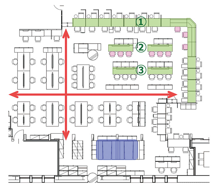 市民課では、“三線方式”による業務フロー再構築と、執務スペースのフリーアドレスを推進。フリーアドレス導入においてデスク規格を統一し、動線を明確化しています。