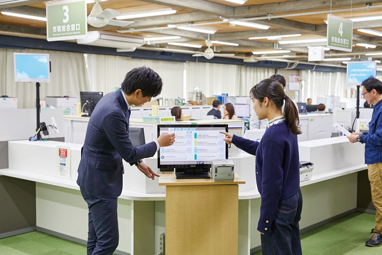 税3課では市民の手続が効率化するよう、3か所に分散配置されていた従来の各課窓口を一本化し、税に関するあらゆる相談や申請に対応できる「市税総合窓口」にリニューアル。さらにコンシェルジュを配置することで、用件の確認など、来庁者をサポートし、円滑な案内・誘導を実現しています。