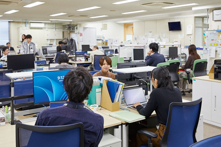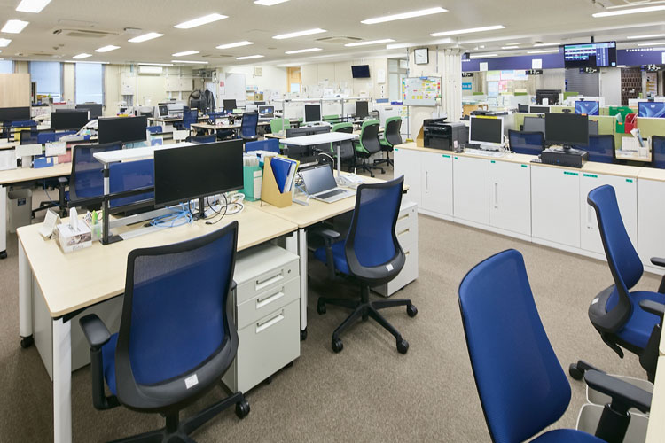 4課の執務用デスクにはモニターレール付のものを採用。モニターを机上面から浮かせて設置できるので、テーブル机上面を有効活用でき、執務しやすい環境を実現しています。