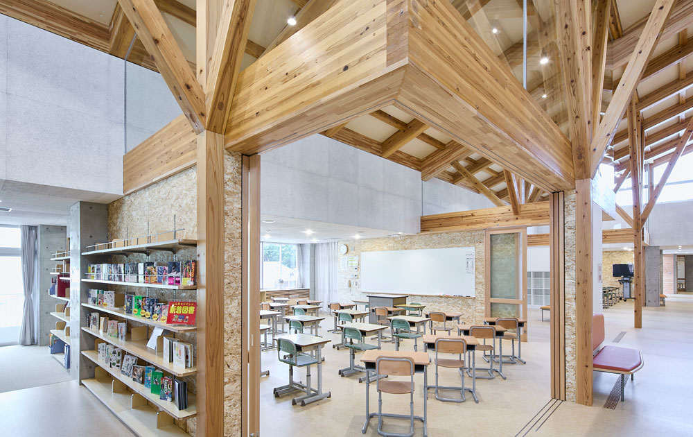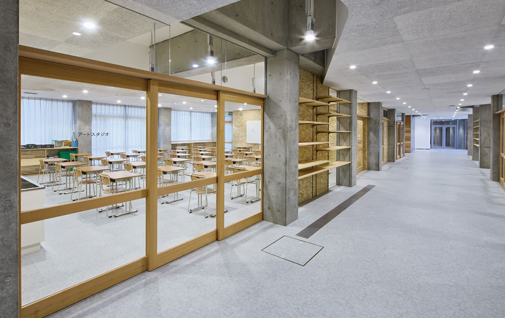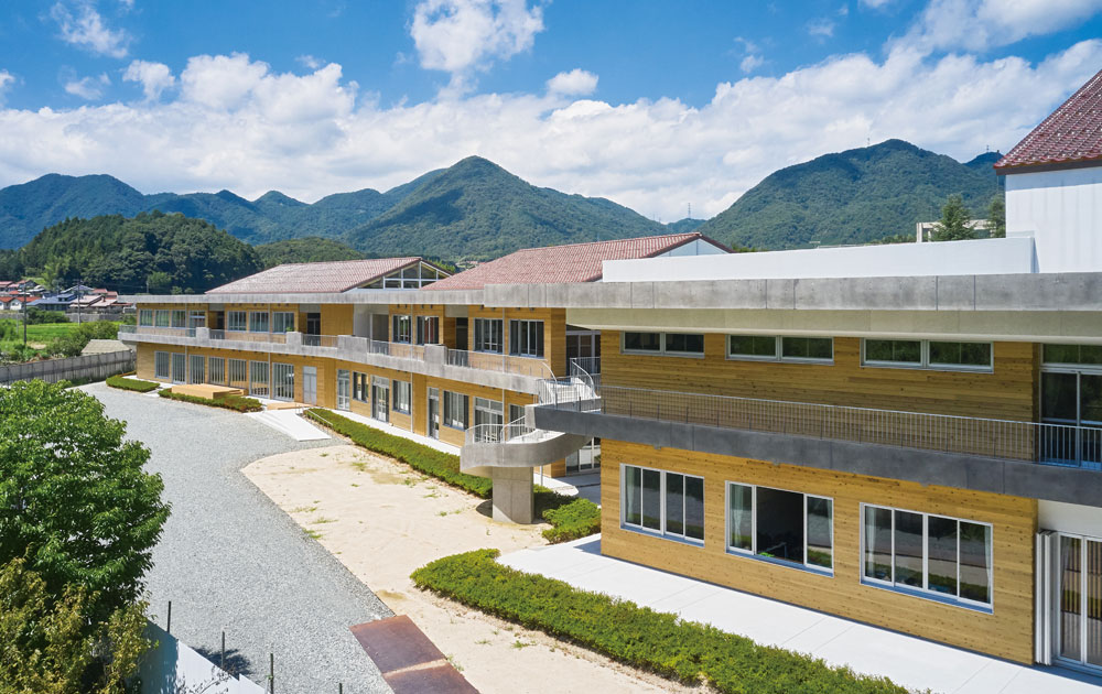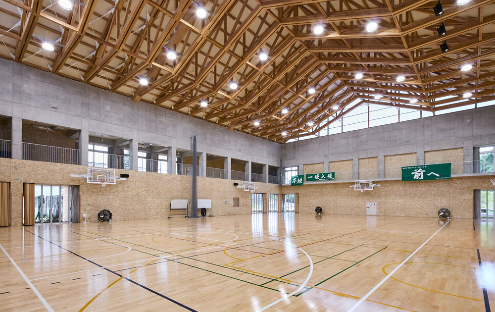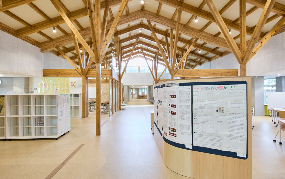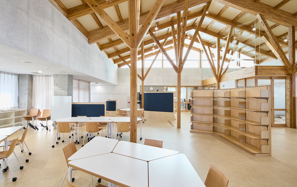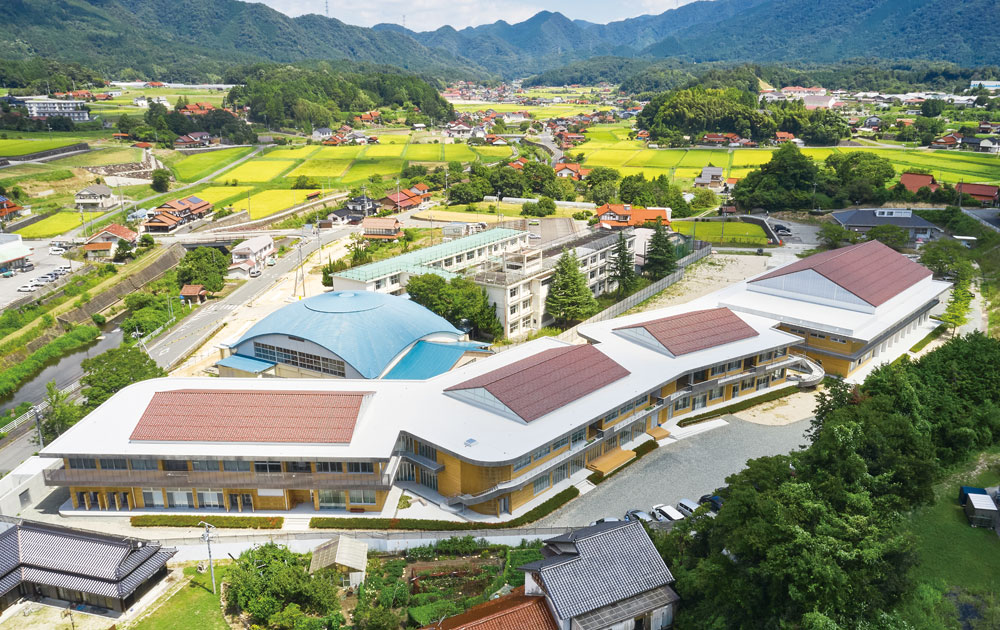 新校舎は、生徒の主体性を養う「教科センター方式(教科教室型)」を採用した設計で、「学びの並木道」や「棚田ホール」など、様々な活動・交流を促す工夫が施されています。また、石見の素材である「石州瓦」「邑南町産木材」を用いており、地域の気候・風土に合わせた校舎となっています。