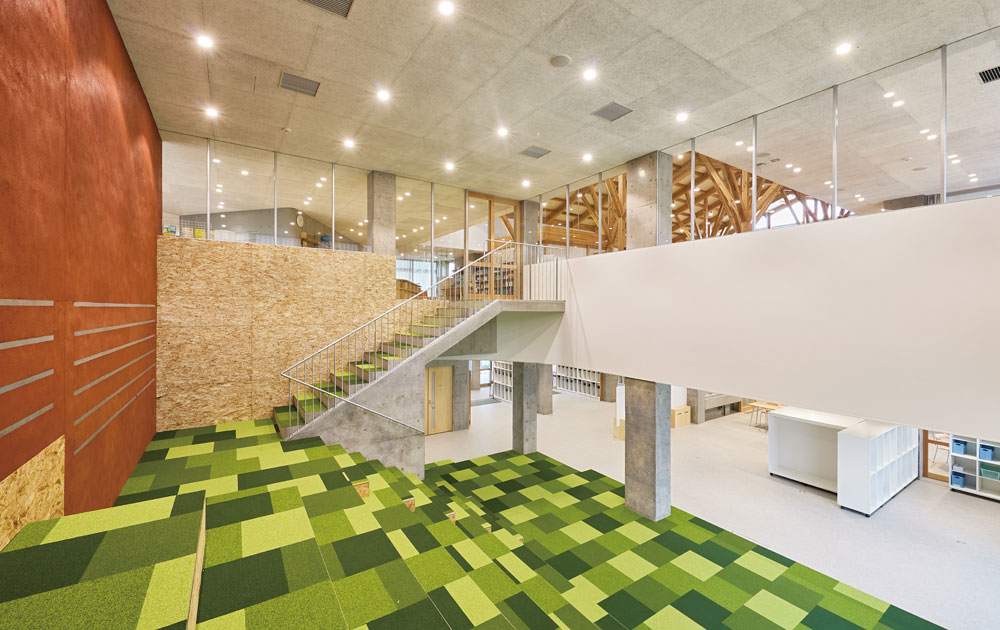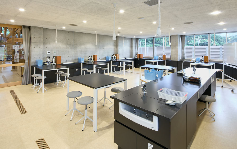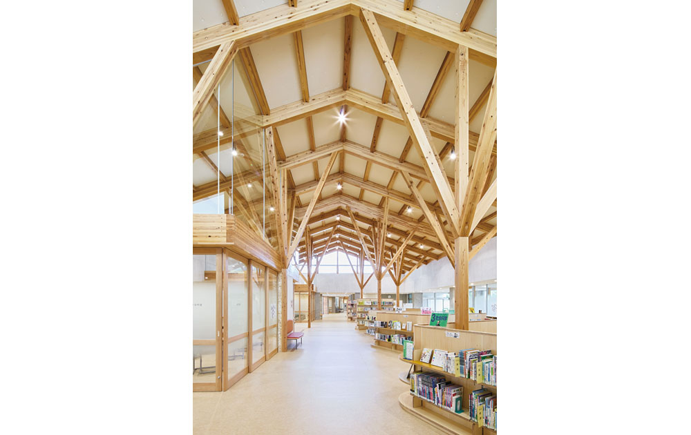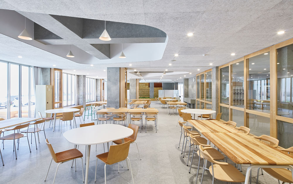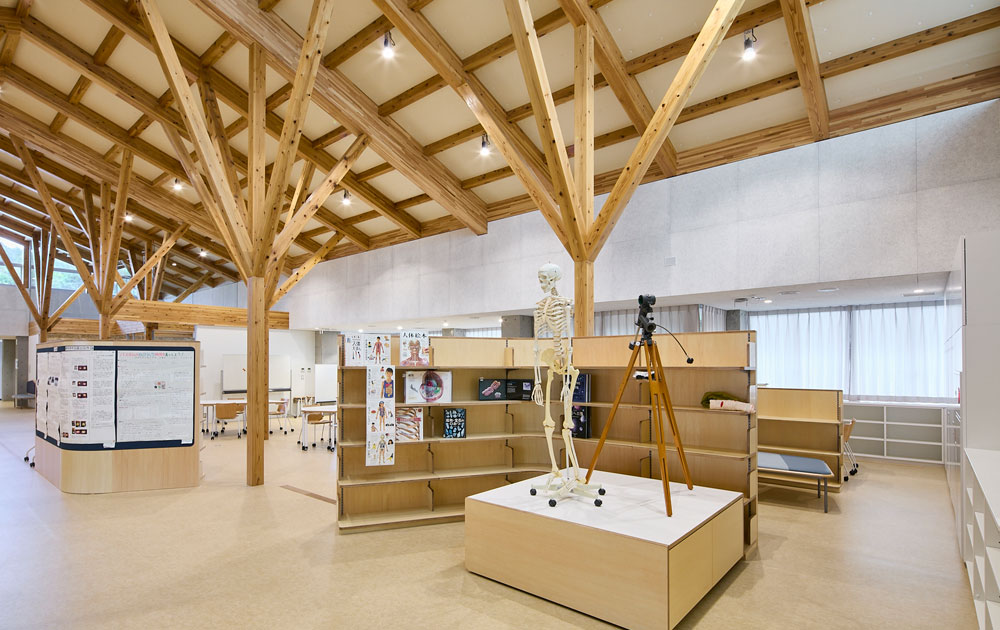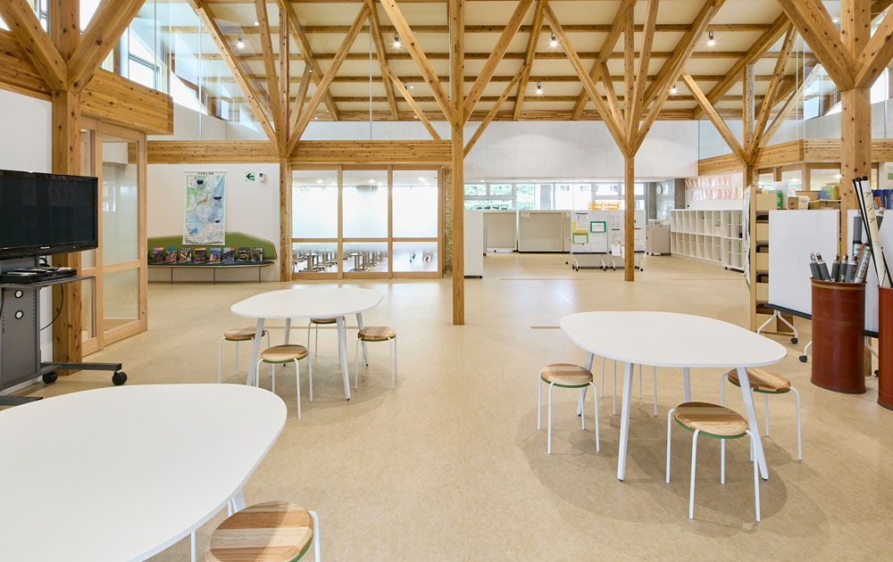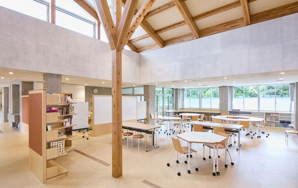 新校舎は、生徒の主体性を養う「教科センター方式(教科教室型)」を採用した設計で、「学びの並木道」や「棚田ホール」など、様々な活動・交流を促す工夫が施されています。また、石見の素材である「石州瓦」「邑南町産木材」を用いており、地域の気候・風土に合わせた校舎となっています。