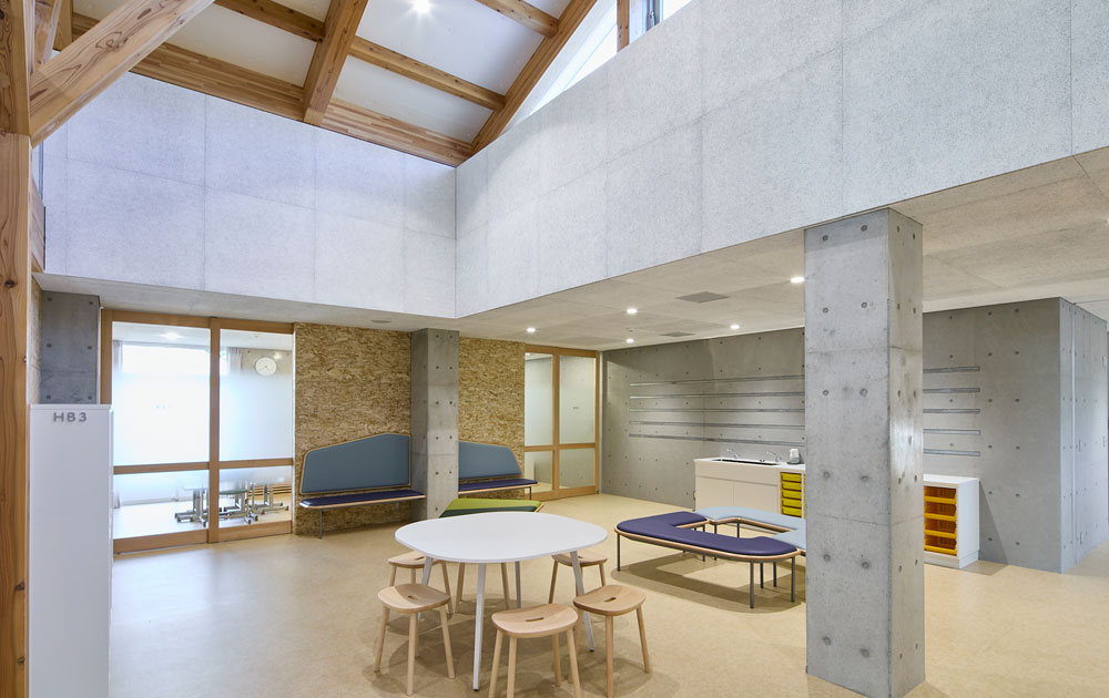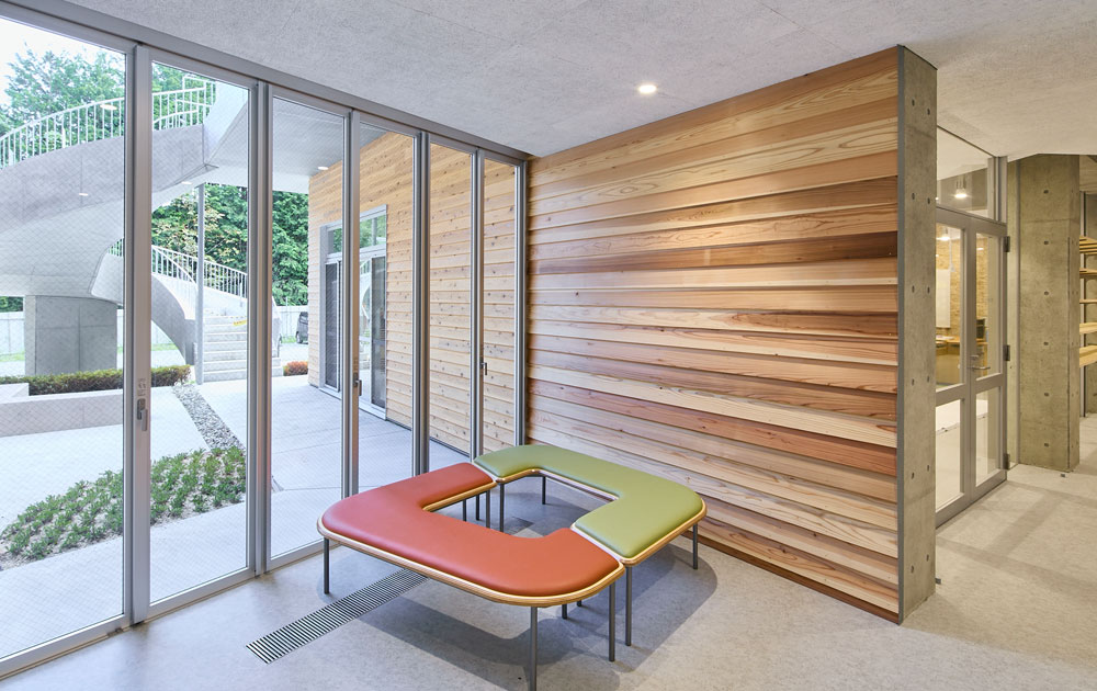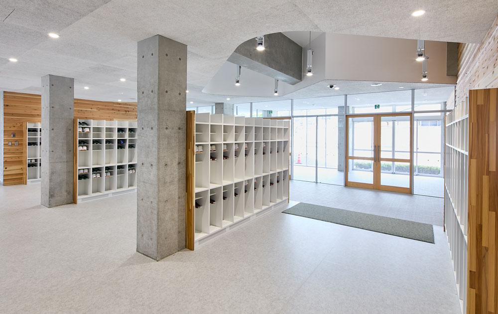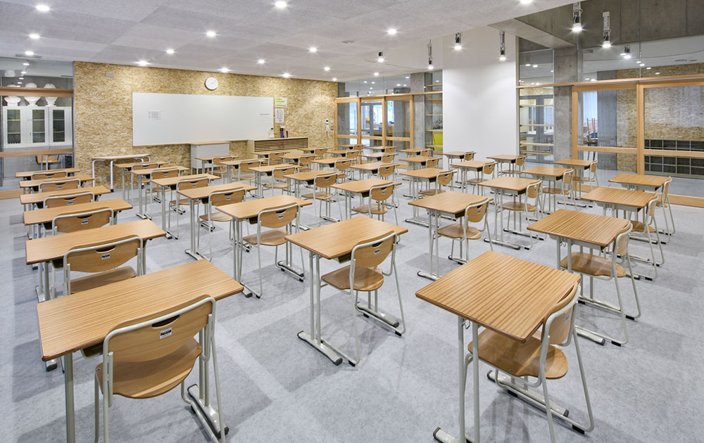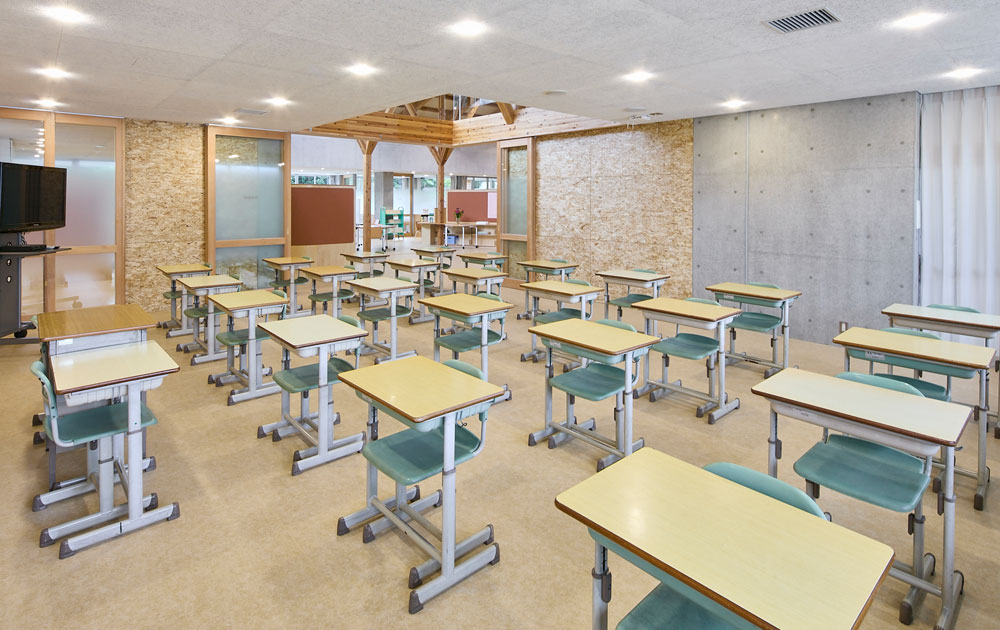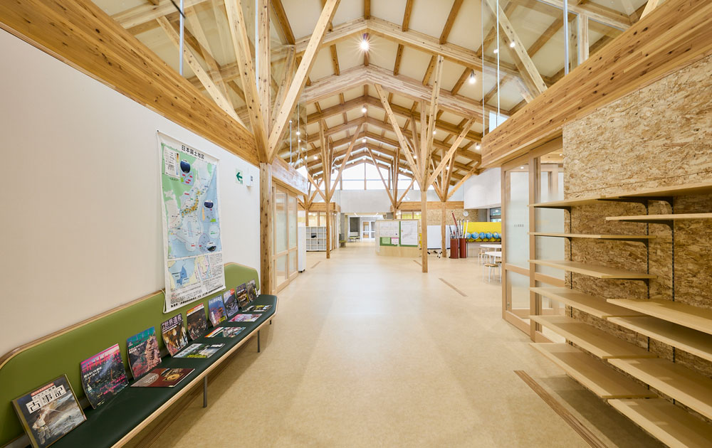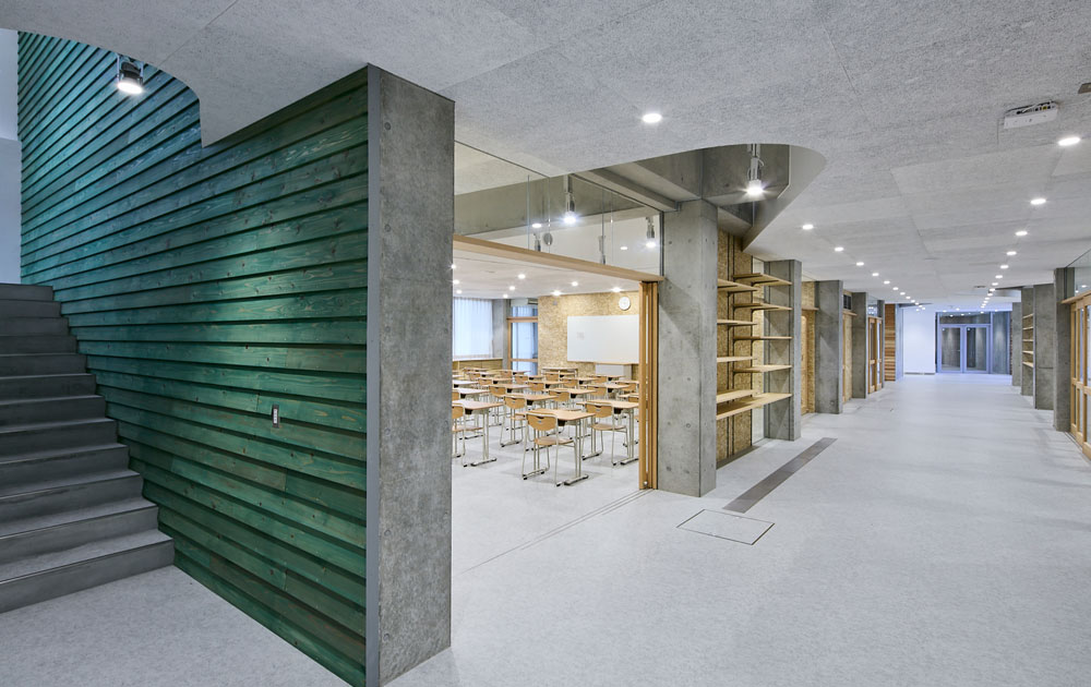 新校舎は、生徒の主体性を養う「教科センター方式(教科教室型)」を採用した設計で、「学びの並木道」や「棚田ホール」など、様々な活動・交流を促す工夫が施されています。また、石見の素材である「石州瓦」「邑南町産木材」を用いており、地域の気候・風土に合わせた校舎となっています。
