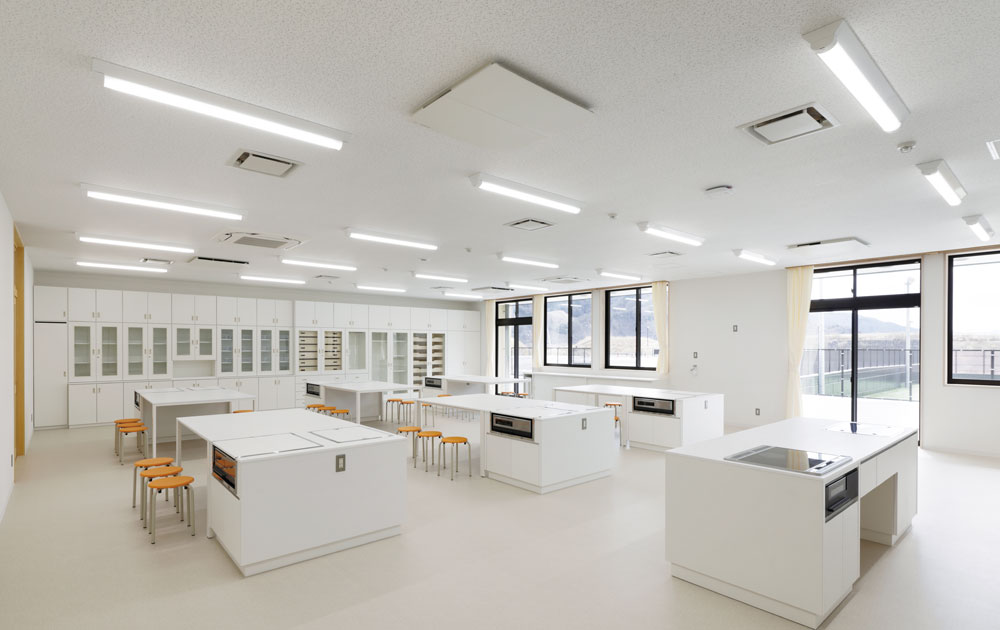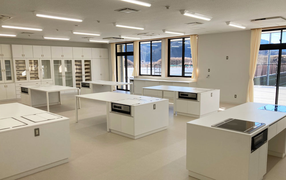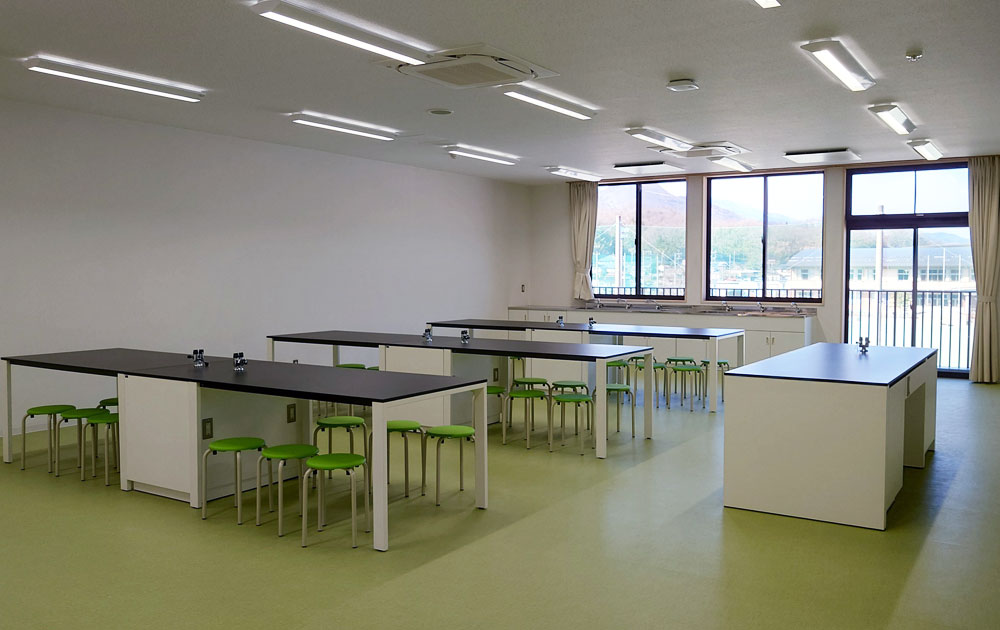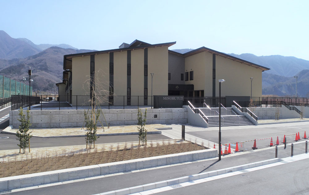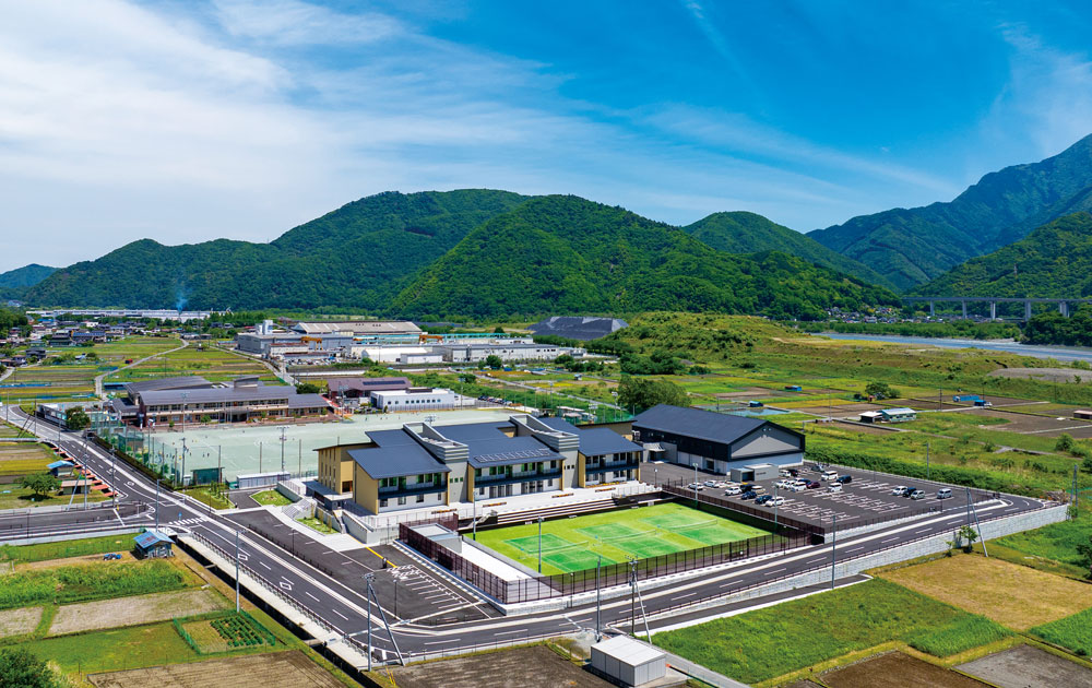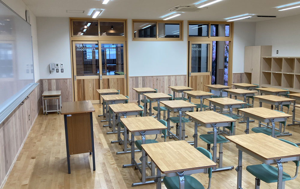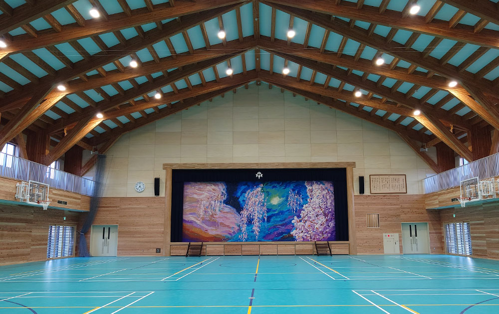 平成28年に町内4つの中学校の統合の後、通学環境平準化を目的として町の中心部に令和6年に移転新築しました。オール山梨県産構造材で建築した県内屈指の大規模木造校舎であり、自然との調和がもたらす木造ならではの落ち着いた雰囲気の、やさしい木の香りと温かみに包まれた学び舎です。