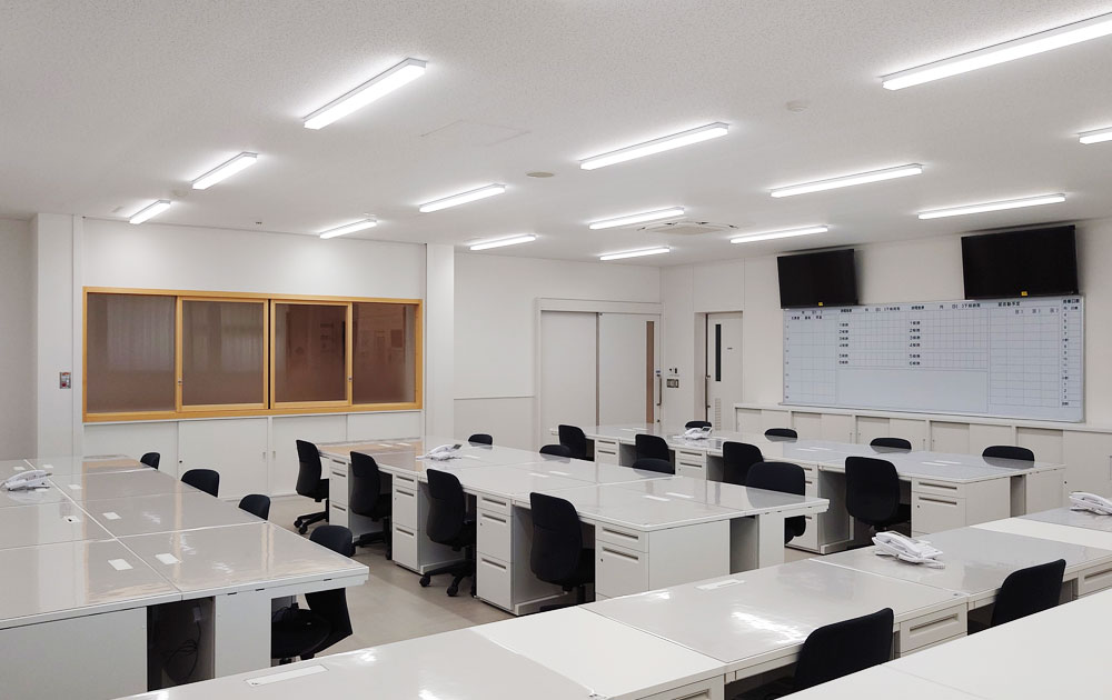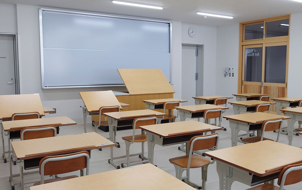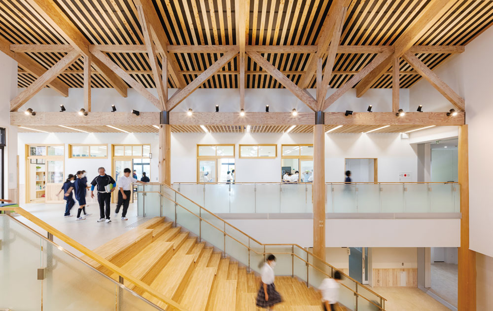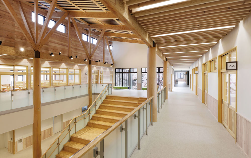 身延山久遠寺より樹齢約100年の杉丸太材と間伐材を寄付いただき、丸太材は校舎のシンボルの木の香ホールや玄関昇降口、間伐材は内装仕上げ材に採用。大階段のガラスには西島和紙が挟み込まれ、紗綾型模様がきれいに浮かびあがっています。