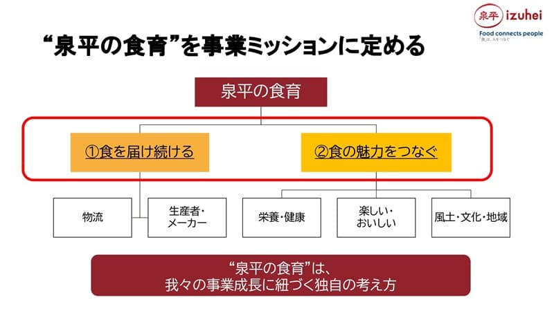 泉平は「食育」を事業ミッションとしており、「食で人をつなぎ、日本で一番“ありがとう”と言われる企業になる」を経営ビジョンとしています。この泉平の「食育」は、「食を届け続ける」と「食の魅力を繋ぐ」という我々の事業成長に紐づく独自の考え方であり、一般的に言われる「食育」とは若干違います。