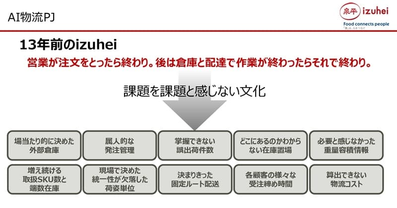 山口様:13年前の泉平は、営業が注文を取ったら終わり。あとは倉庫と配達で作業が終わったらそれで終わりという感じでした。課題を課題と感じないというのが、その当時の文化でした。
