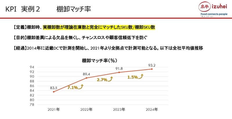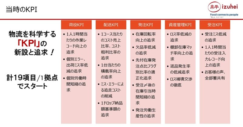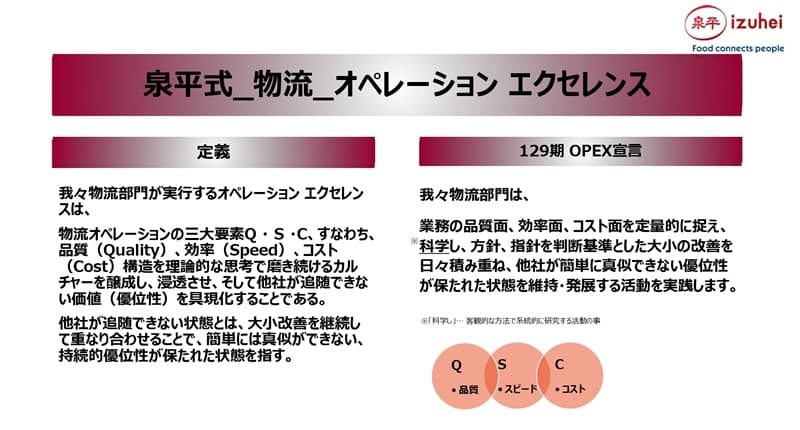 まず1つ目の「KGI・KPIからオペレーションエクセレントの定着」ですが、「泉平式オペレーションエクセレンス」は、単なるオペレーションの最適化だけではなく、データを可視化し、現場で具現化し、文化として定着させることを目指しています。KPIを数字で終わらせることなく、行動・判断・連携に結びつけるということです。これは物流部門だけではなく、営業本部、管理本部でも別途このような定義を宣言し、会社全体として取り組んでいます。