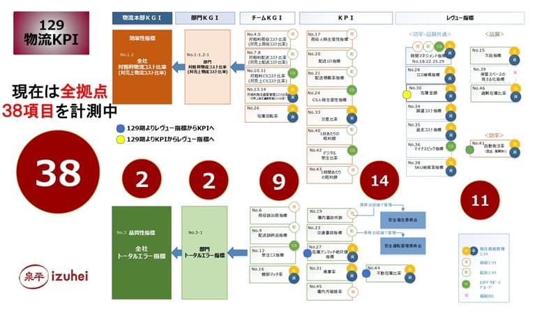 菊田様:泉平様の物流KPIの図は、発注資産管理、荷役、配送、カスタマーサポート、福岡DCと各ユニット(部門)別に色分けし、KPI、チームKGI、部門KGI、物流本部KGIと体系的に配列されています。これは「物流のあるがままを可視化」したという意味で私は非常に素晴らしいと思います。今後、物流共同化などに取り組んでいく上で、物流の実態の可視化が第一歩になると考えています。
