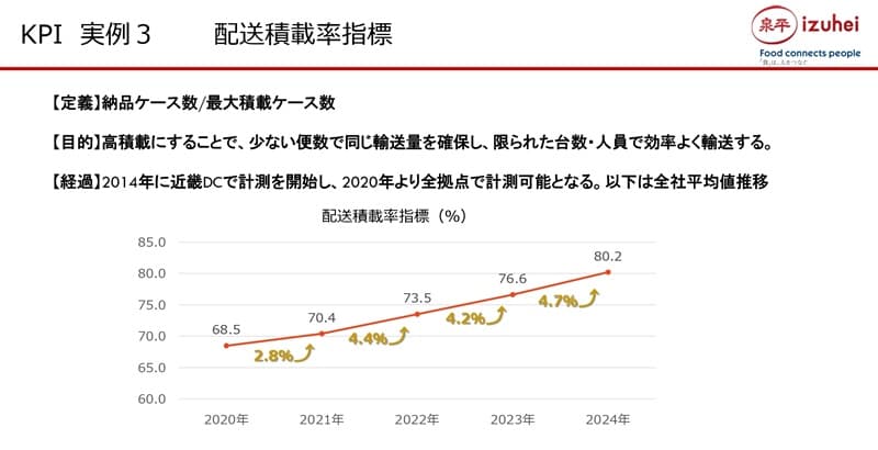 次に「配送積載率指標」ですが、これはトラックの最大積載ケース数に対する納品ケース数の割合です。例えば、最大積載ケース数が300ケースに対し240ケース積んだ場合には80%と算出します。言うまでもなく、100%に近いほど良い。年々上昇していることがわかります。