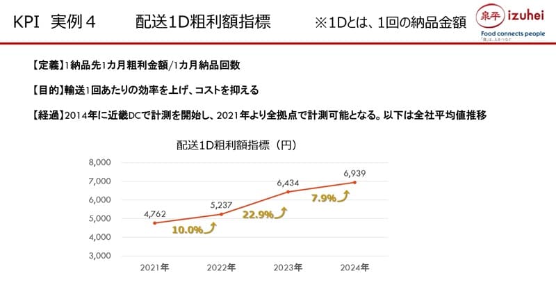 4つ目の「配送1D粗利額指標」ですが、この「1D」というのは、「One Drop」という意味で、1回の納品先の金額です。「1カ月の納品先の粗利額/1カ月の納品回数」で、納品1回当たりの粗利額が出ます。2021年は4,700円だったものが、2024年には6,900円まで引き上がっています。