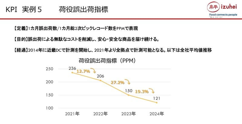 最後に「荷役誤出荷指標」ですが、これは1カ月の誤出荷件数と先ほどの出荷レコード数の比率をPPMで表した指標です。2021年の236PPMから2024年の121PPMに改善しました。ちなみに、このPPMというのは「Parts Per Million」で、「100万分のいくつか」という意味です。121PPMなら「100万分の121回発生した」ということです。ごく小さな不良率や誤差を直感的に把握でき、かつ比較しやすい表現として用いています。