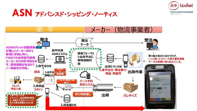 菊田様:私が特に注目しているのは、ASN(アドバンスド・シッピング・ノーティス)です。これは、納入業者が、荷受け側にあらかじめ送る「事前出荷情報」のことです。ASNには、出荷予定日や商品コード、数量、賞味期限などが含まれるため、荷物が届いたときにはパレット単位、あるいは1車単位等でほぼノー検品で荷物を受け取れることが期待されています。泉平様の場合はどこまで進んでいますか?