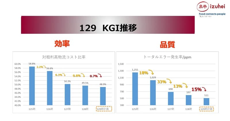 これらを現場で徹底した結果、KGI推移は、対粗利高物流コスト比率が4年前の58.8%から、今年の前期で49.5%まで改善できています。トータルエラー発生率も4年前の1,255PPMから、今年の前期で597PPMまで改善できています。