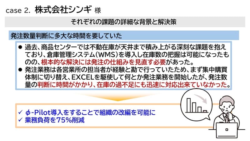 松浦様:シンギ様は、包装資材の企画・製造・販売を行う企業です。大きく3つの課題を φ-Pilot を活用して解決した事例になります。