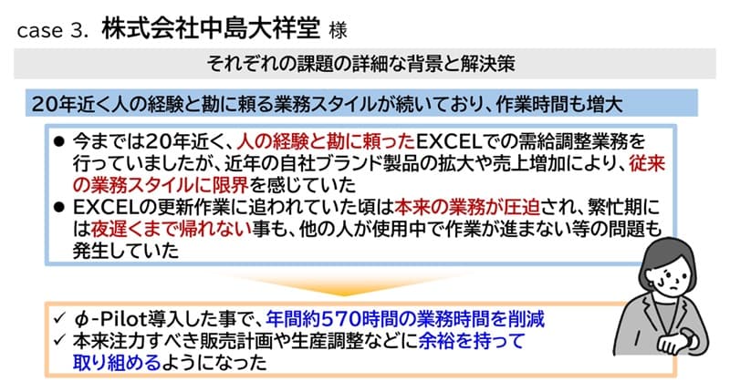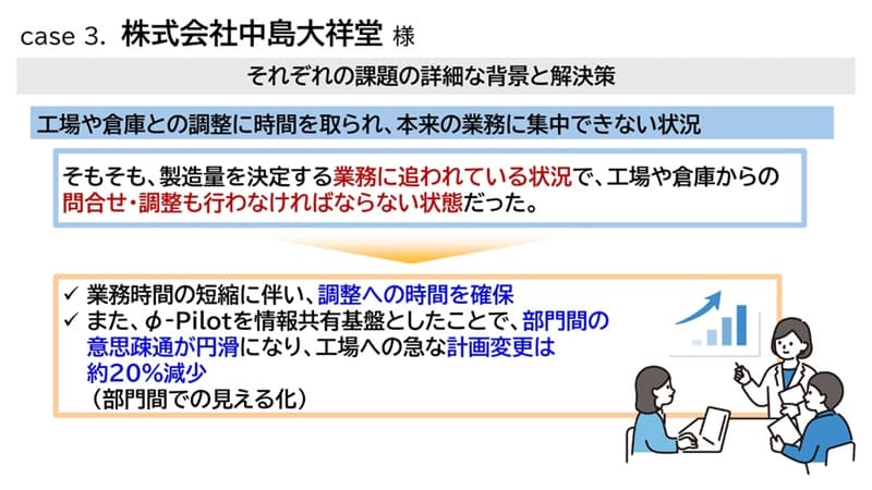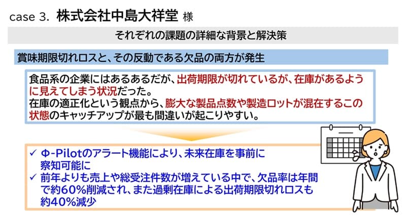 松浦様:中島大祥堂様は、和洋菓子などの製造販売を行っている大阪の企業です。大きく3つの課題を φ-Pilot を活用して解決した事例になります。