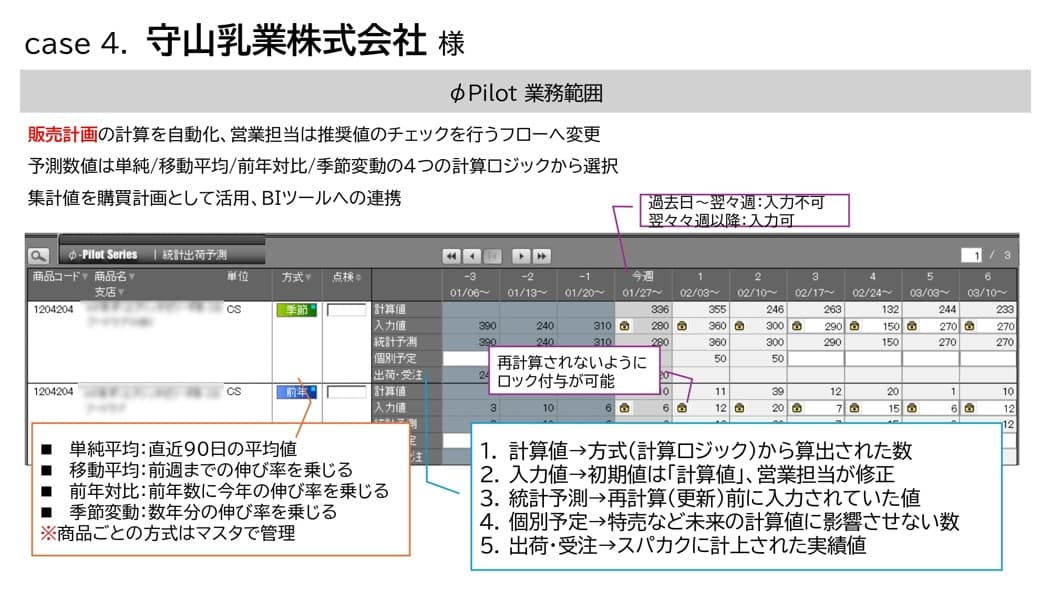 販売計画は、元の計算自体は自動でφ-Pilot側で主に行うので、チェックをして修正を行う場合には、修正数値を入れます。予測の数値は、「単純予測」「移動平均」「前年対比」「季節変動」という4つの計算ロジックから選択できるようになっています。