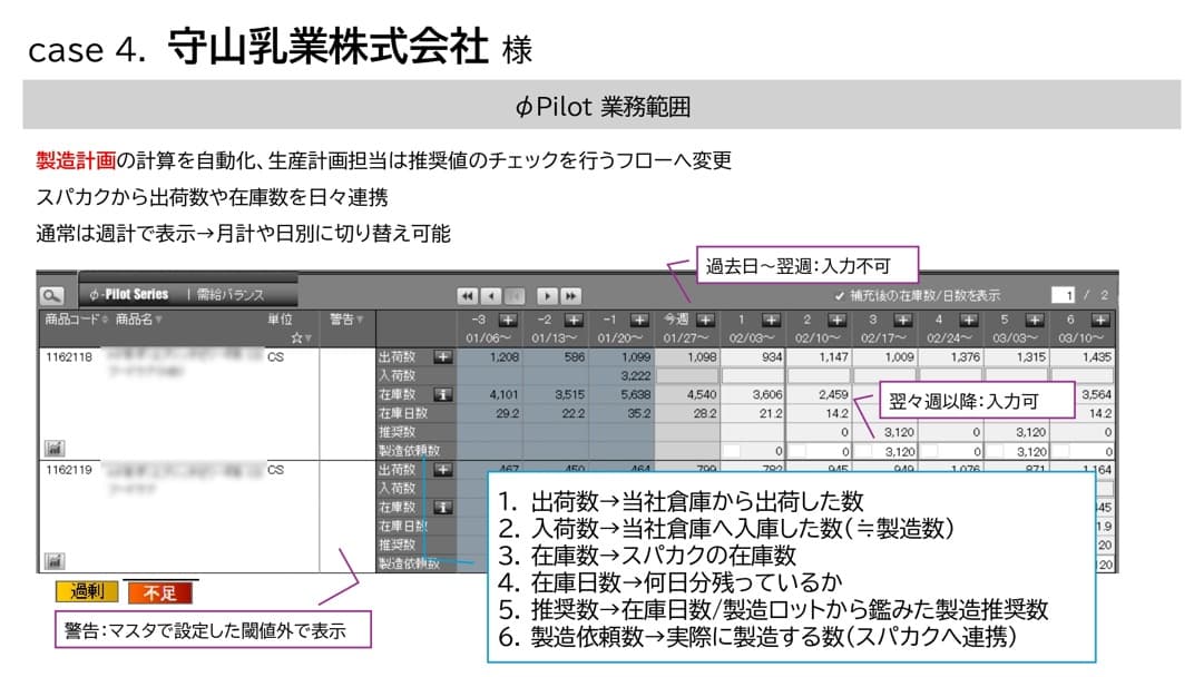 この課題に対しては、シオノギヘルスケア様の倉庫から出荷された数をベースに、製造数を決める形にしました。これは、不透明な情報を見るのをやめて、正確な情報をベースにすることで精度を高めるという業務改革の成功事例だと思います。使用期限についても、φ-Pilot を入れたことによって、期限を加味した製造判断が可能となりました。