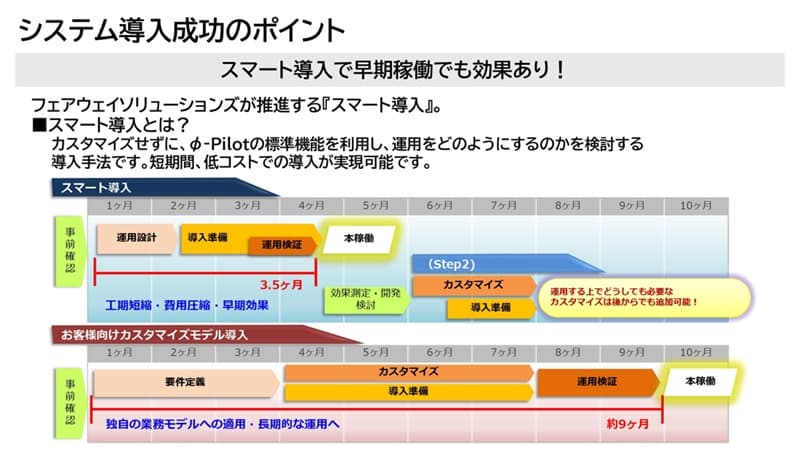 こうした無駄を省くために、まずは標準機能でやれるところまでやり、どうしても欲しい機能は後から追加するという「スマート導入」というプランを推奨しています。簡単に言うと、カスタマイズせずに、まずは φ-Pilot の標準機能を使って、どのような業務を達成したいのかを検討いただき、次のステップとして、欲しい機能を追加して、カスタマイズモデルに進むというものです。これによって短期間・低コストでの導入が可能になります。