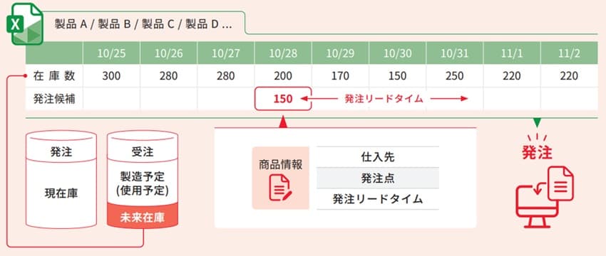また、発注点の設定が非常に重要になります。発注してから入荷するまでのリードタイムを加味した日数分の在庫を発注点とする必要があります。一度定めた数値を定期的に見直すことが大切です。
